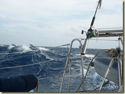 Waves break over back of boat and into the cockpit at times. The weather forecast says the waves will be up to 11 feet. I look at the monsters and think “no way”. Mike then explains that they measure the height from the sea surface so the wave height for an 11 foot wave prediction is actually more like 23 feet.